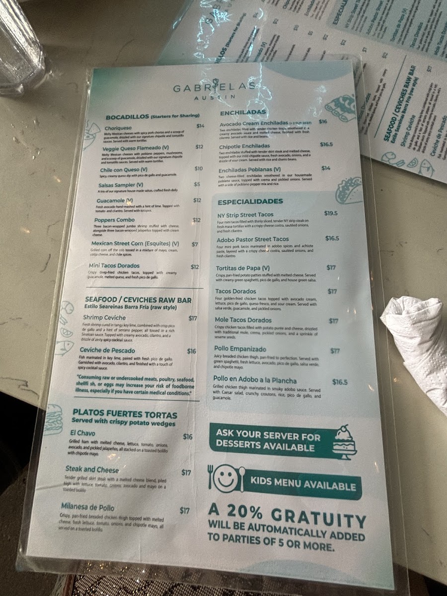 Many find the menu ideal for brunch moments filled with flavorful classics like huevos rancheros or Veggie Enchiladas, while others appreciate the evening’s more spirited selections, including margarita flights and salsa samplers that encourage sharing and exploration. Overall, the offerings at Gabrielas Downtown balance traditional ingredients with casual dining pleasure, fitting seamlessly into the warm and energetic vibe of downtown Austin.